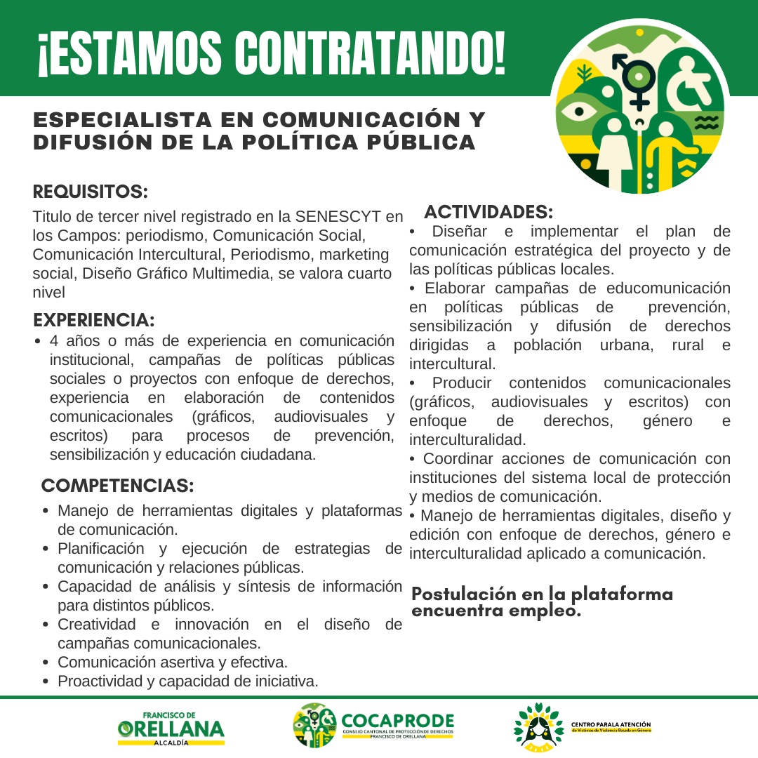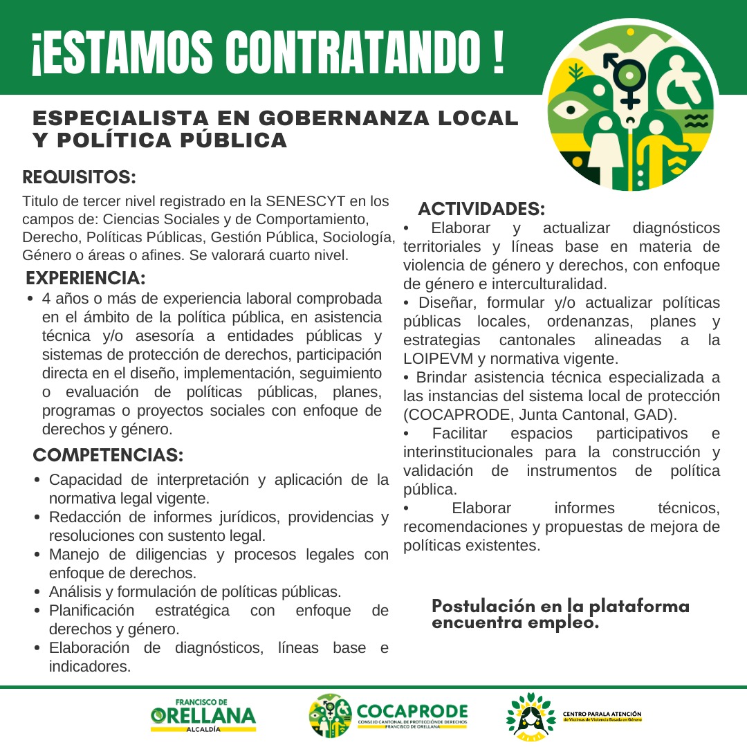 El Consejo Cantonal de Protección de Derechos de Francisco de Orellana es un organismo paritario de nivel cantonal integrado por representantes del Estado y la Sociedad Civil. Ejerce atribuciones de formulación, transversalización, observancia, seguimiento y evaluación de las políticas públicas de protección de derechos, articuladas a las políticas de los Consejos Nacionales para la Igualdad.